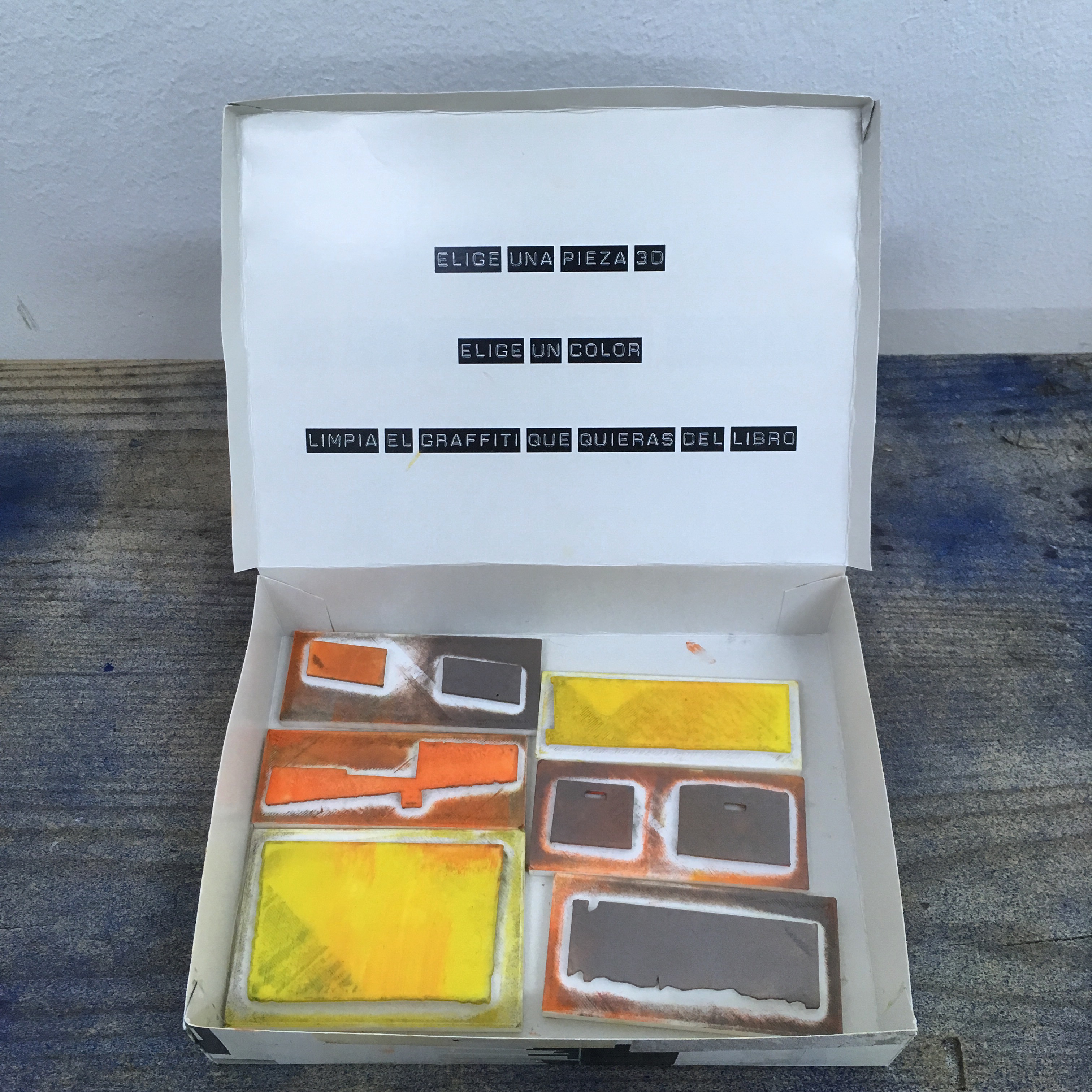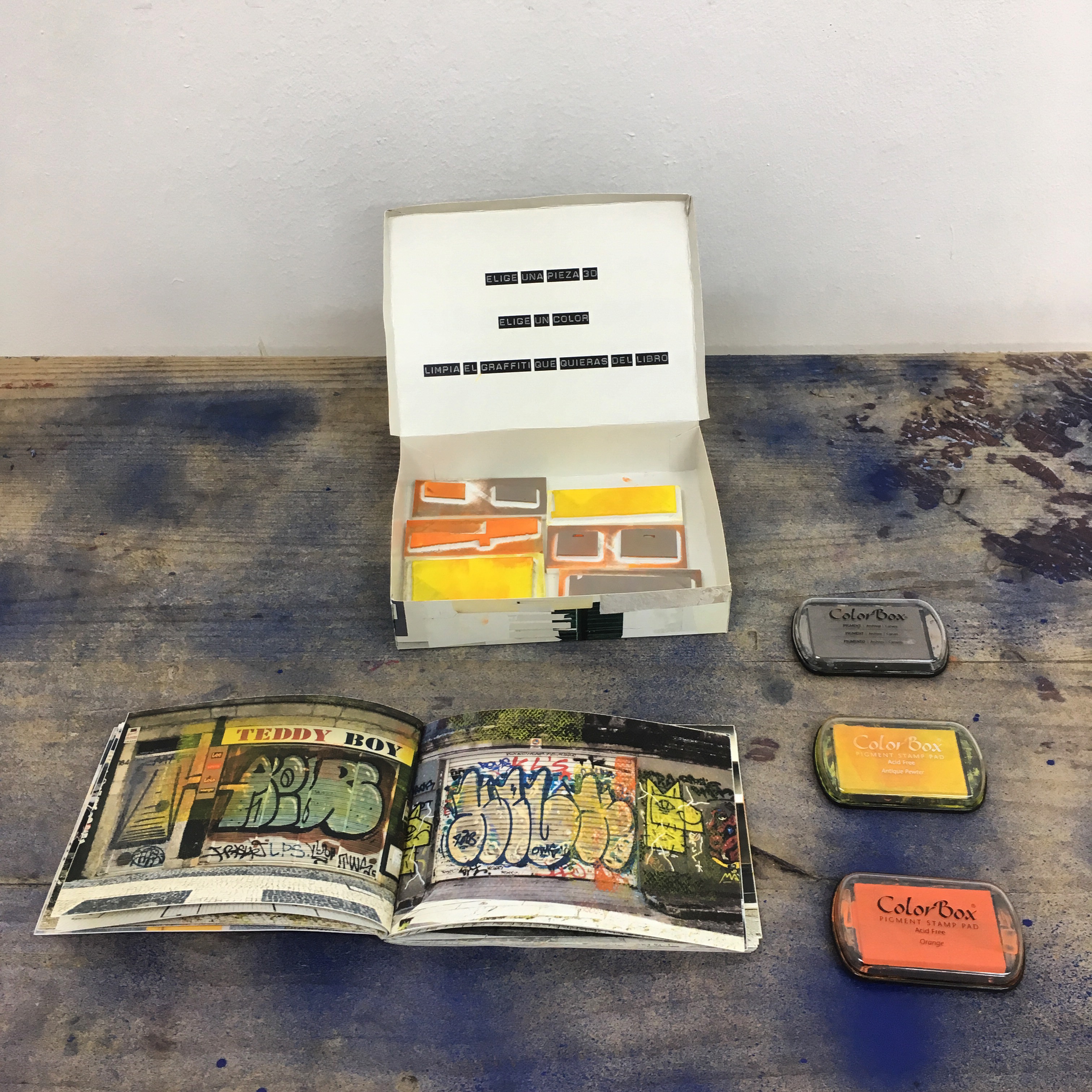 Be an Abstract Artist comes from the same context as Clean City Tour. In this piece I created a photo book that shows the graffitis around the city. The viewer is invited to choose one of the stamps, one color and “clean” one of the graffitis in the book. In this sense they have to make the same formal and esthetic choices as the graffiti cleaners, chosen which graffiti deserves to stay in the book and which should be cleaned.