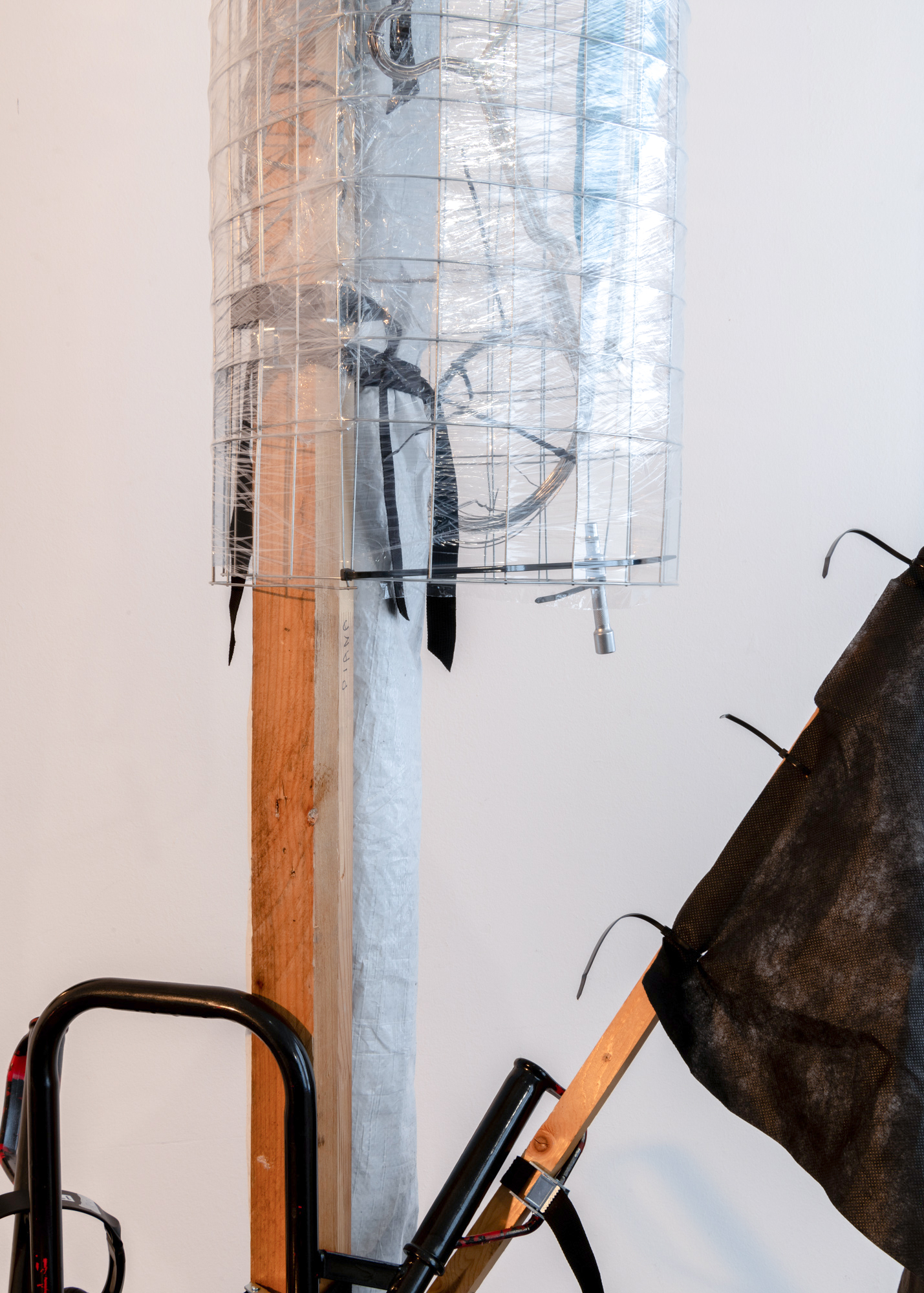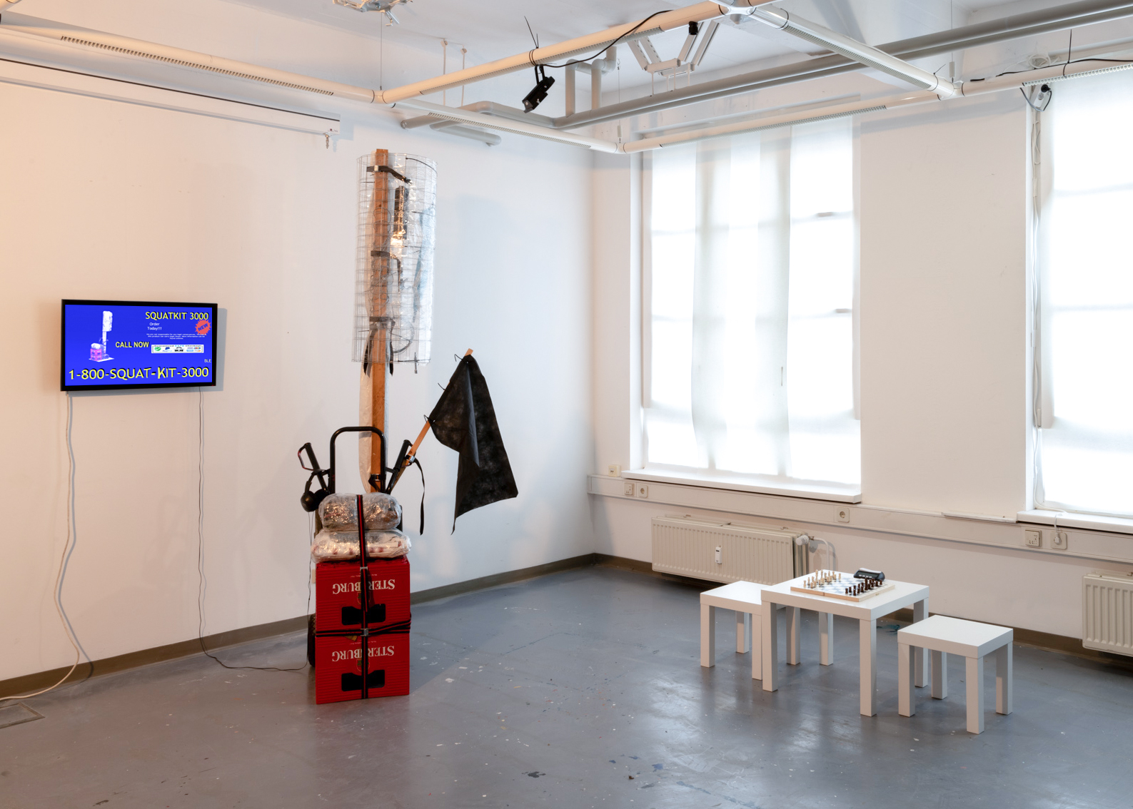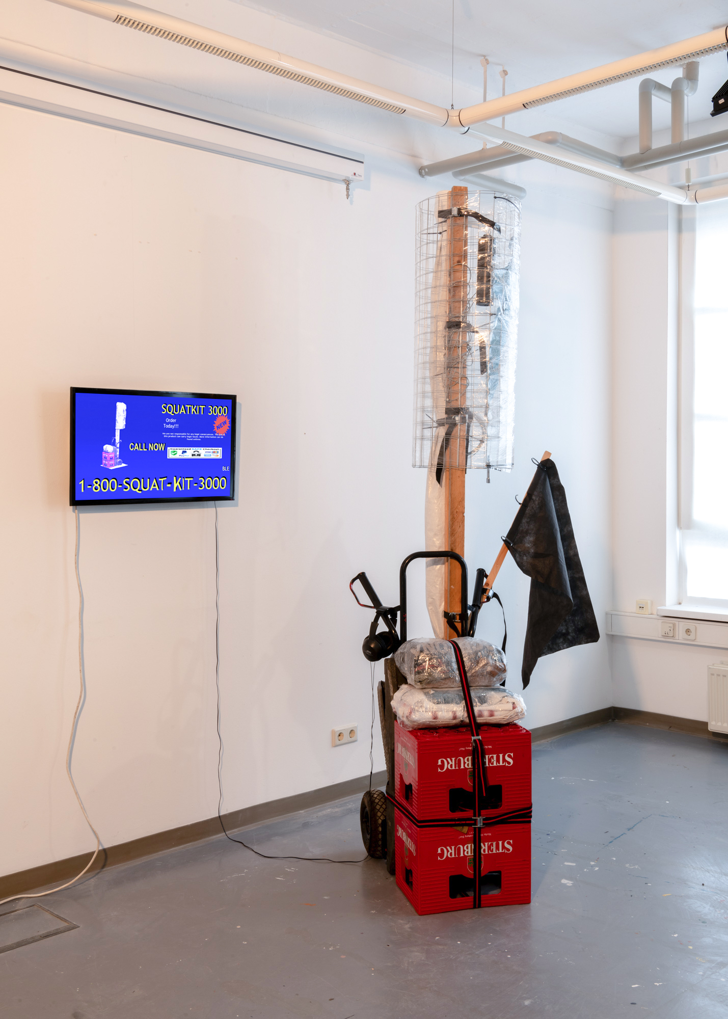 The installation deals with the capitalistic mechanisms that are set in motion by the act of squatting. Exploring the ways in which spaces are claimed in Western society, it borrows the aesthetics from a squat, an ultimate symbol of an anti-authoritarian movement, that starts off as a means of survival and then gets absorbed by the power dynamics of modern capitalism, inevitably taking its place in the violent cycle of gentrification. SQUATKIT 3000 is presented as the ultimate package for claiming spaces, within this context the kit can be used and displayed everywhere.