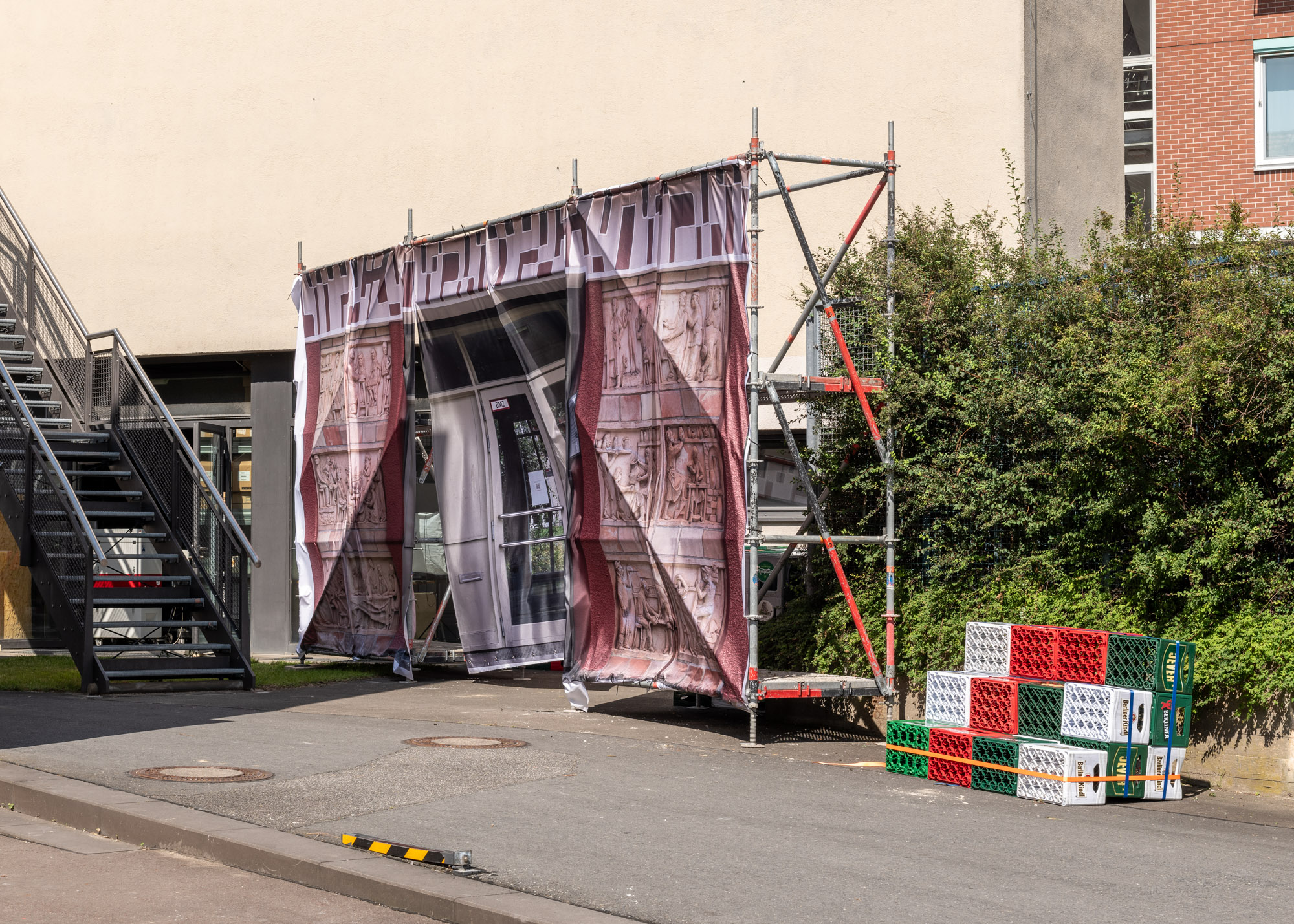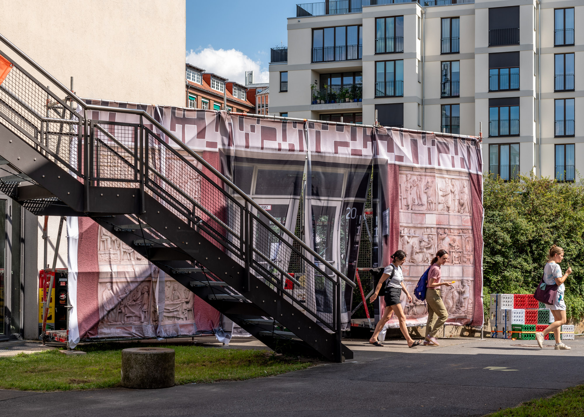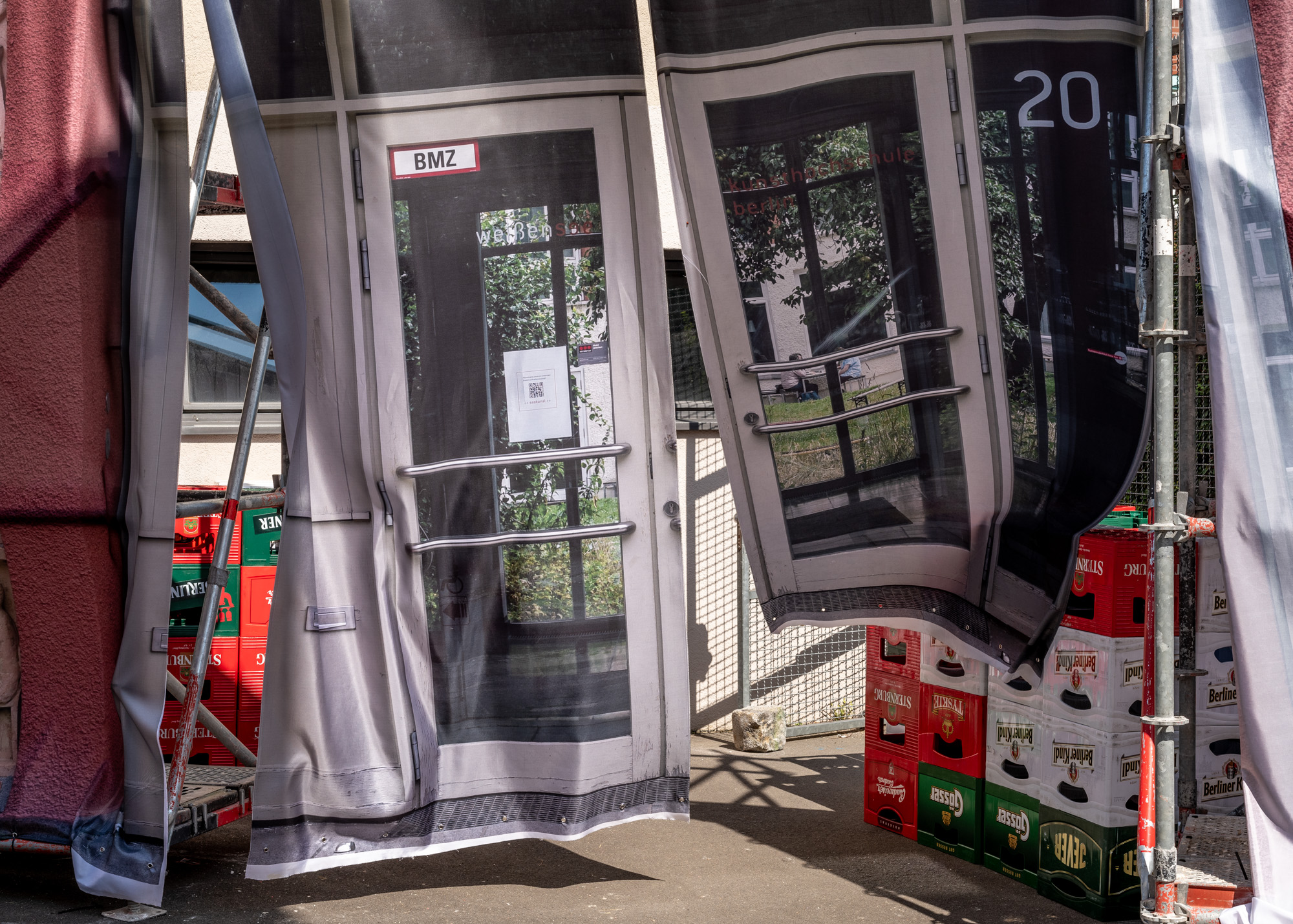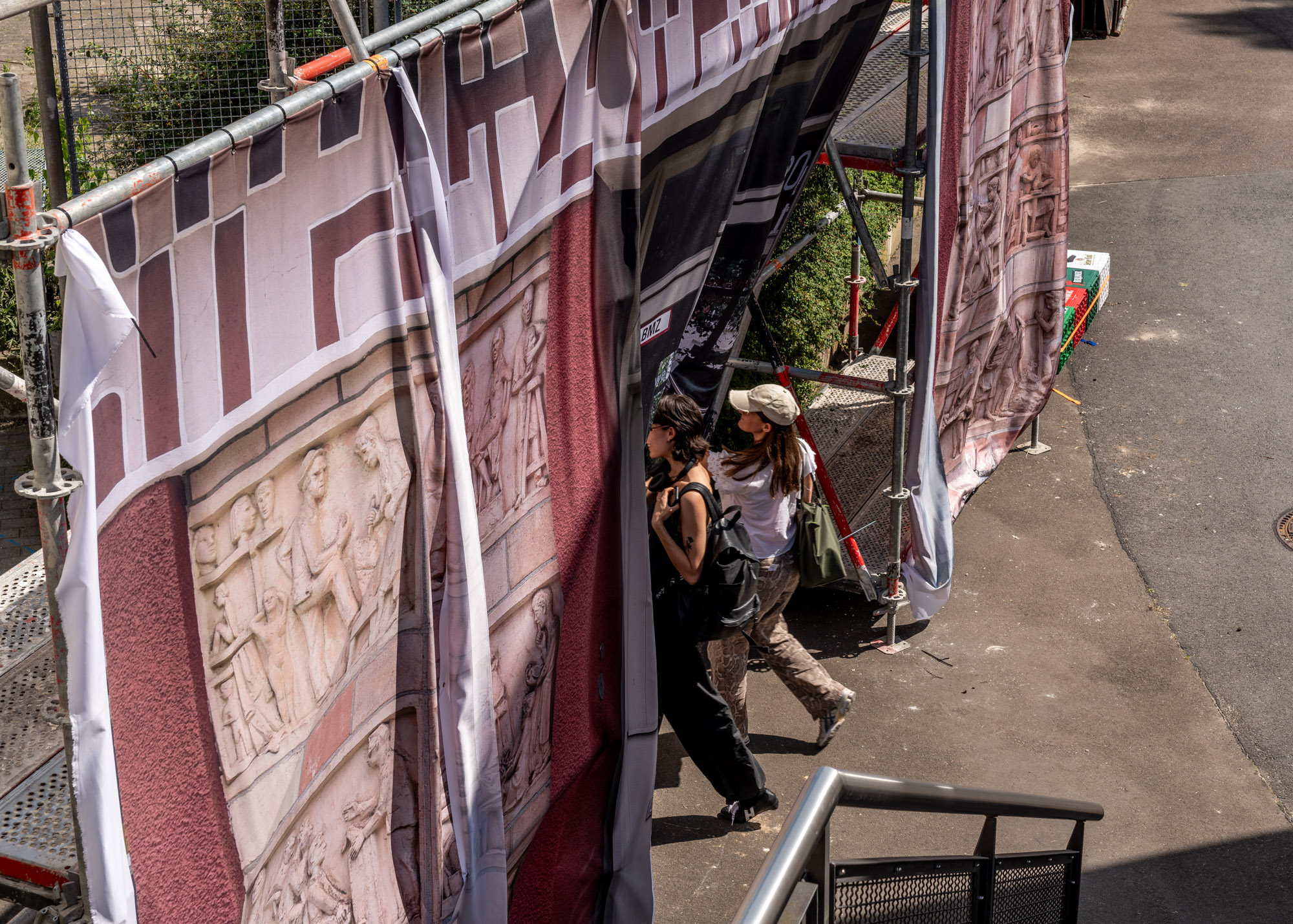 Furthermore, by using typical construction site elements like scaffolding, fabric, metal rivets and cable ties, we invite to reflect on what it means to construct, reconstruct and deconstruct, especially in a city with such complex and significant building history like Berlin.