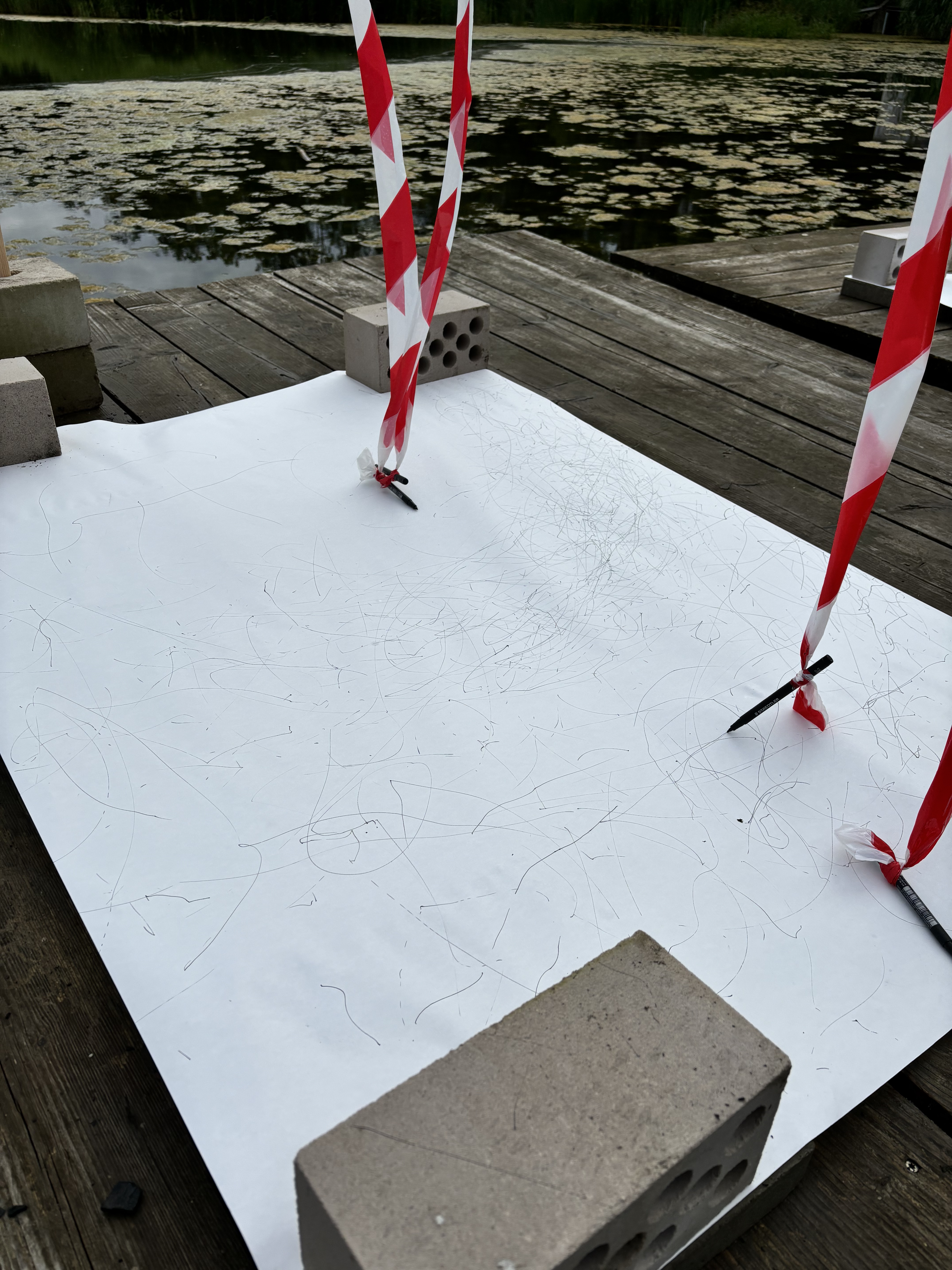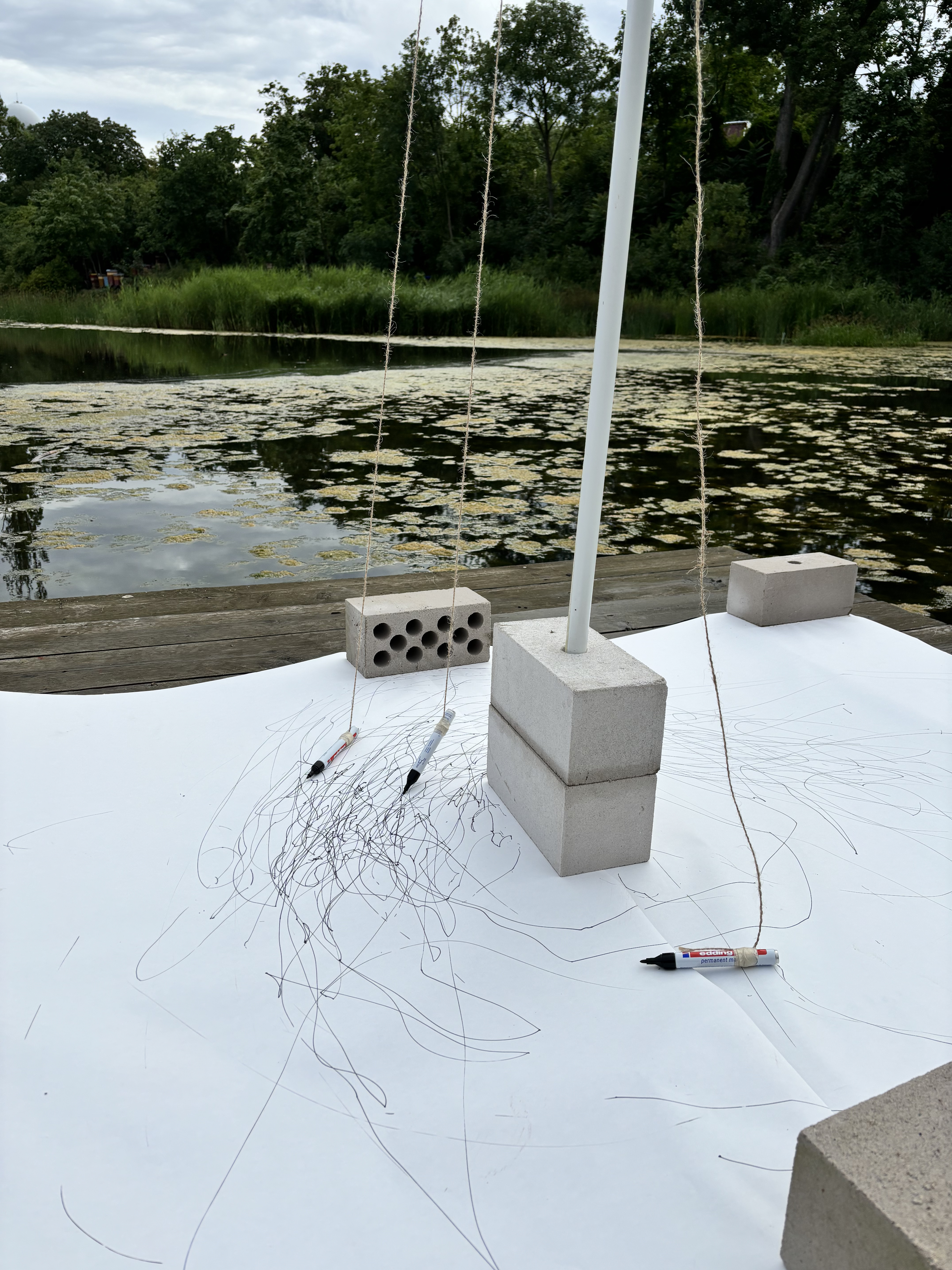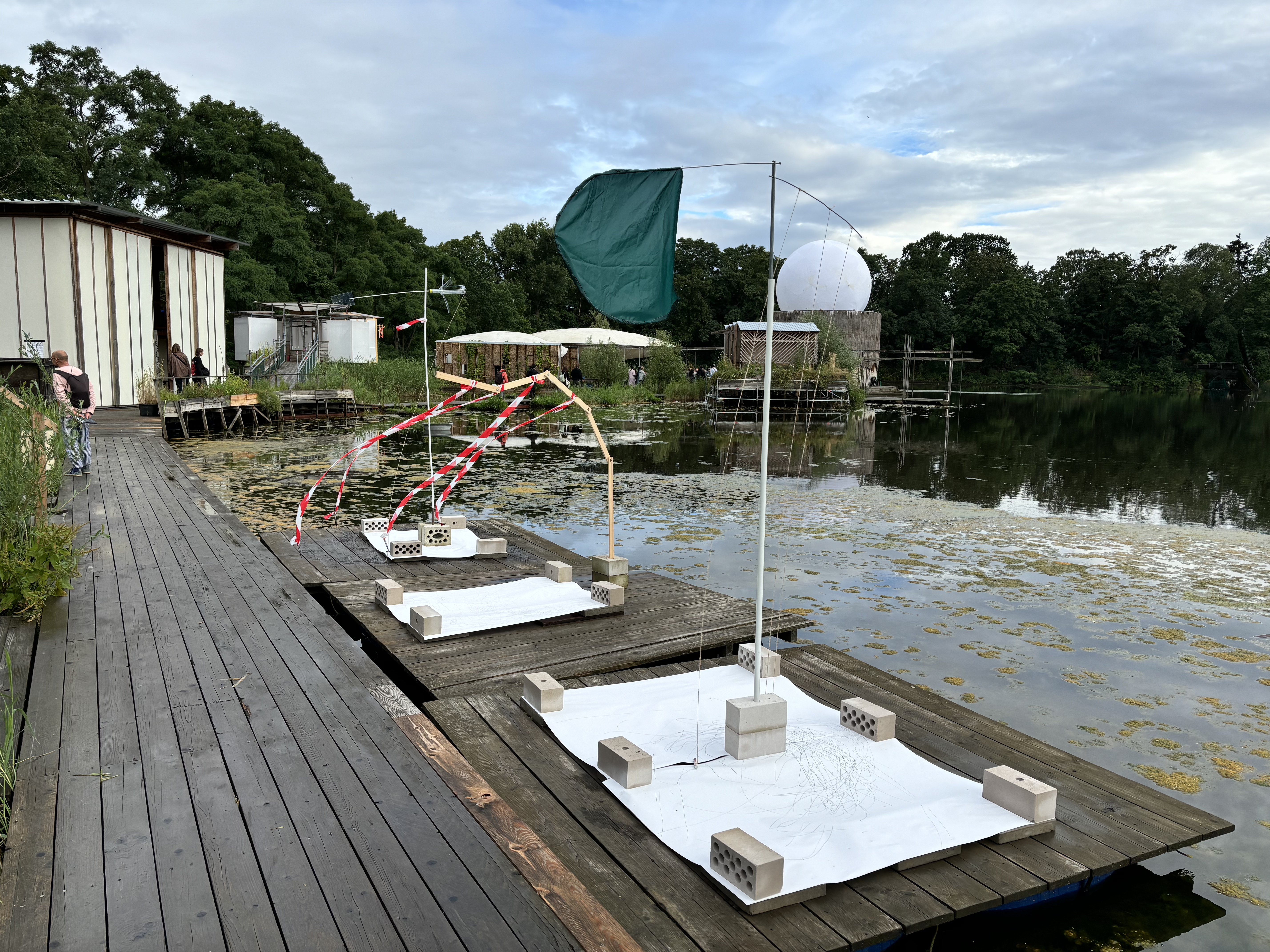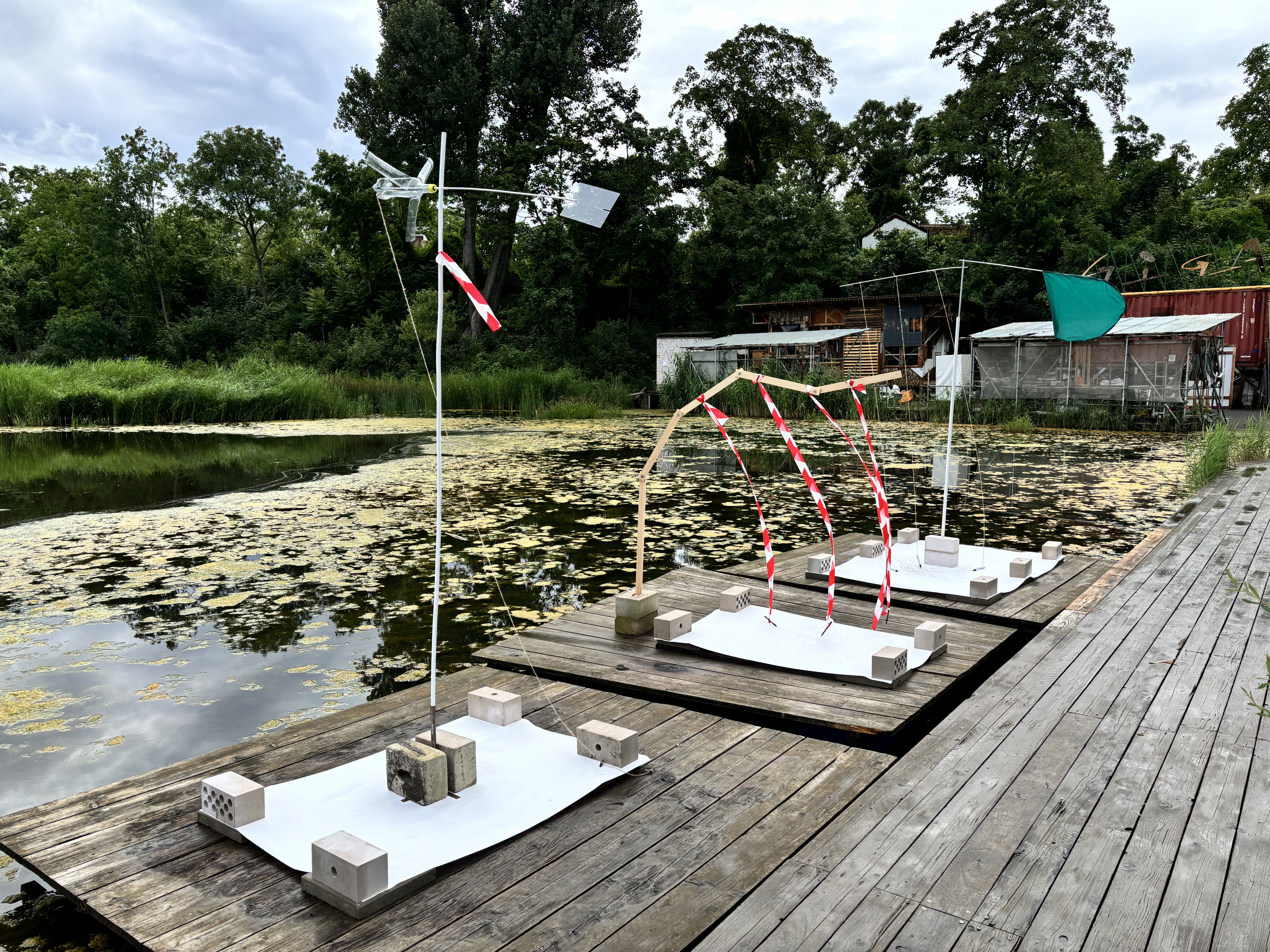 The series of wind catchers emerged from couple months of experimentation and seminars at Floating University. The three sculptures enter into a dialogue with a constant, unpredictable force of this place: the wind. Throughout the exhibition, they collaborate with the wind’s chance movements, creating a unique drawing that records this encounter.